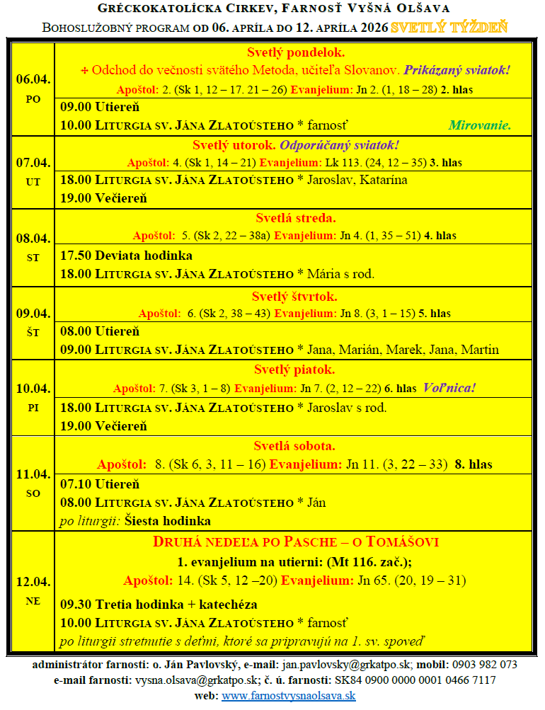 Liturgický program 06.04. – 12.04.2026 – Svetlý týždeň